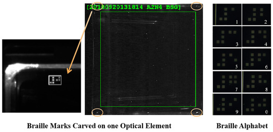Braille marks [31] representing the last four digits of element numbers were engraved at the four corners of every optic, as depicted in Figure 3. These Braille marks served as reference points for orientation during the processing of FODI images. By aligning the FODI image with these marked corners, we ensured that each image was standardized to have the same detection coordinates.
