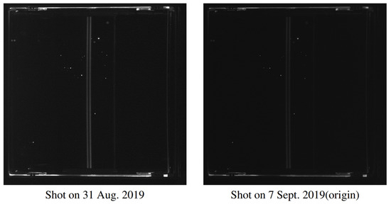 To address this challenge, we adopted an offline approach instead of an online inspection to meet practical demands during weekly maintenance of the facility. Before installation or after removal, optics were placed into a dark box and subjected to side illumination to obtain offline dark-field images [29]. This procedure helped to eliminate the influence of background light or downstream optics. Consequently, any white dots observed in the offline image could be confidently identified as authentic damage, as shown in Figure 2.