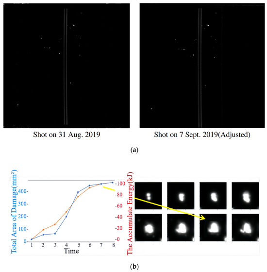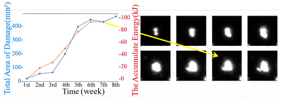 To obtain the specific physical location and size of each damage, we utilized affine transformation to convert the detection result data (pixel coordinates) into physical coordinates. This allowed us to determine the precise physical location and size of each damage. Figure 16a illustrates this process, where the damage area is represented on the ordinate axis, and the accumulated energy value from the experiment is represented on the abscissa axis, establishing a coordinate system. According to the numerical fitting results, the growth pattern of tiny damages from the initial stage approximates linearity over a period of time.