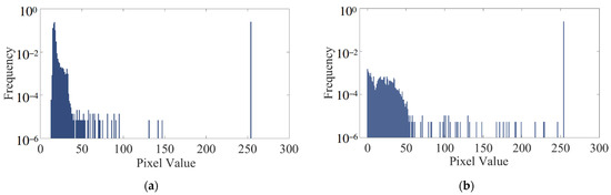 Next, we proceeded to adjust the contrast of the image. While achieving complete uniformity in contrast values may not be feasible, our objective was to equalize the low-contrast areas to bring them closer in value. Figure 7a depicts the gray distribution histogram of the FODI image captured on 7 September. Noticeably, pixels with values close to 0 constitute a relatively high proportion and are densely distributed, suggesting that the image is generally dark and exhibits low contrast. Subsequently, we equalized the histogram of the image, resulting in the histogram displayed in Figure 7b. Upon examination, it is evident that the gray distribution after processing is more uniform, signifying an enhancement in image contrast.