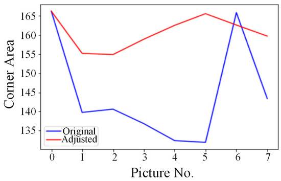 Each Braille mark can be conceptualized as a unique combination of a group of small circular points. Therefore, we employed a feature extraction technique for detecting circles, namely the Circle Hough Transform (CHT) [32]. This method was combined with the standard Braille pattern corresponding to the last four digits of its component number to identify and locate Braille marks. Figure 9 illustrates the Braille target pixel area detected before and after adjusting the brightness and contrast of the eight pictures. It is evident that the adjusted Braille target area values are similar, indicating that the eight pictures essentially achieve normalization in terms of brightness and contrast.