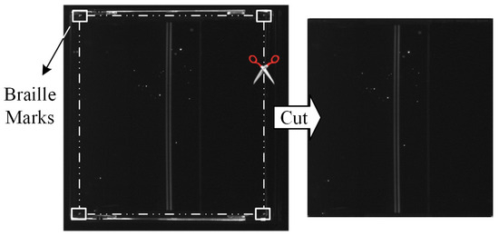 To establish the mapping between online and offline images, we utilized Braille positioning to standardize their coordinate systems. Upon obtaining the coordinates of the four corner Braille marks, the original image was cropped to extract training set samples, as depicted in Figure 10.