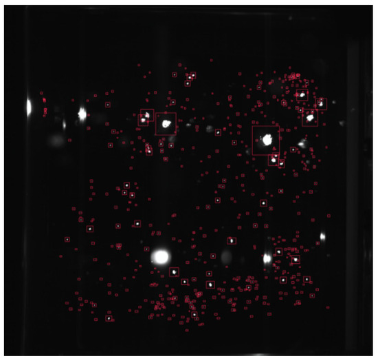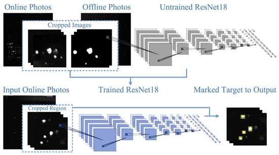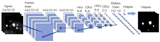 The resolution of the online and converted offline images, approximately 3000 × 3000, exceeded the neural network’s input capacity. Consequently, the images were resized into smaller patches with a resolution of 32 × 32 pixels for inputting into the network. Subsequently, the LASNR [43] algorithm was employed to identify highlight positions and determine their full extent on the offline image. These marked points on the offline image represented actual damage instances and served as input labels for training the network, as illustrated in Figure 13. We used the Adam optimizer [44] to train the network. The initial learning rate was 10−3, which allowed the network to converge quickly. The network was iteratively trained with a mini-batch of size 50 until the loss of verified samples was not reduced. For each iteration, we took randomly enhanced samples as input to the network. We then changed the learning rate to 10−4 and iterated the above process to fine-tune the model, until the network converged.