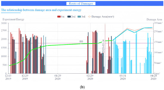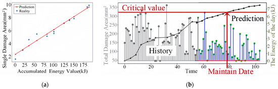 Figure 19b presents similar content to Figure 16b, depicting the prediction for overall damage trend variations. By combining future experiment plans and relevant experimental parameters with predictions, the system can effectively manage all elements in optimal conditions. When the damage area approaches a critical point, maintenance warnings are issued to prevent catastrophic damage. Experimental results demonstrate an accurate prediction ratio for damage area, exceeding 90%. This robust predictive capability ensures proactive maintenance and enhances the overall operational efficiency and safety of the system.