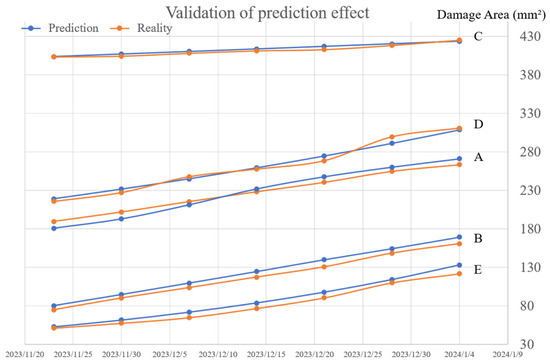 To assess the accuracy of the predicted damage area, we selected five components and predicted their total damage areas for the upcoming period at each time node. Subsequently, we compared these predicted areas with the actual damage areas observed after completing the experiments in the next period, which spanned over a month. The results of this comparison are presented in Table 1 and Figure 17.