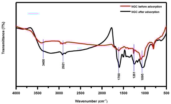 The FTIR spectrum of NGC before MB adsorption shows that five bands are observed, as in Figure 2, which reveal stacked spectra of NGC after adsorption (black) and before adsorption (red). The characteristic bands highlight alterations in band intensities rather than any noticeable shifts. For instance, the 3400 cm−1 bands denote ʋ (O–H) stretching, the 2921 cm−1 bands denote ʋ (C–H) stretching, and the band at 1700 cm−1 can be assigned to (C–N) stretching. The band at 1261 cm−1 indicates ʋ (C=O) stretching, while 1095 cm−1 indicates ʋ (C=C aromatic) stretching. Notably, the band related to (C=O) stretching displays a downward shift at 1243 cm−1 of approximately 20 cm−1 in frequency after adsorption. This suggests a significant hydrogen-bonding interaction between C=O and MB []. The vibrational modes of the (C=C aromatic) stretching band before adsorption shifted to 1044 cm−1 implying modification of ring vibration, which is indicative of interactions like pi–pi interactions with MB [].