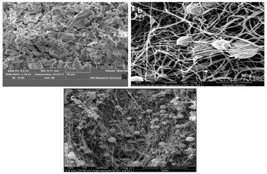 PET nanofibers were produced by electrospinning using post-used PET cups as we described previously []. The electrospinning process was modified by adjusting several factors. The flow rate was established at 1 mL/h, the needle-to-collector distance was set at 15 cm, the PET concentration was maintained at 5%, and an applied voltage of 15 kV was utilized [].