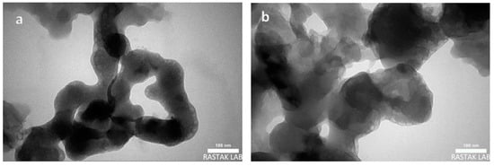 The utilization of TEM measurement provides advantages in visualizing the morphology and structure of individual nanocomposites resulting from the combination of Auo@PPh2-PIILP and PET-NF. Figure 4 serves as evidence confirming the successful formation of the composite. NGC composites exhibit distinct morphologies and decrease in particle size for each specimen due to an increased quantity of gold particles (Figure 4a); this characteristic may also be linked to the polyphenolic composition of PPh2-PIILP []. A higher quantity of MB absorbed onto NGC reveals heterogeneous, uneven particles of varying sizes and shapes. (Figure 4b).