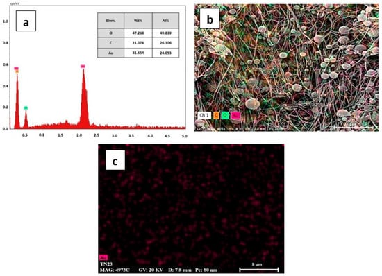 Chemical composition analysis of NGC was carried out using Energy Dispersive X-ray Spectroscopy (EDAX) and Elements Distribution Mapping (EDM). The EDAX spectra of NGC (Figure 5a) displayed elemental peaks corresponding to oxygen, carbon, and gold, with weight compositions of 47.268%, 21.076%, and 31.654%, respectively, confirming the composite nature of the material. Subsequent analysis of atomic compositions unveiled that oxygen, carbon, and gold accounted for 49.839%, 26.106%, and 24.053% of the total composition, respectively. The images obtained through EDAX and EDM indicated a uniform distribution of gold within the composite material (Figure 5b,c) [].