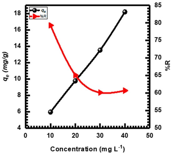The impact of the initial concentration of MB, ranging from 10 to 40 mg L−1, on the process of adsorption was investigated. Figure 7 displays the relationship between MB adsorption and adsorbent concentration. It is clear that as the concentration of the adsorbent increases, the amount of MB adsorbed also increases. However, the percentage of MB removal decreases with higher initial concentrations of MB. An increase in the initial concentration of MB promotes a stronger interaction between MB and NGC, resulting in a higher uptake of adsorption. These findings are consistent with previous studies [,].