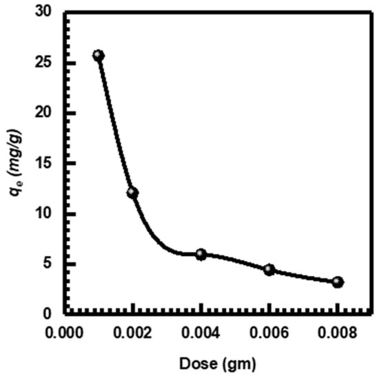The information presented in Figure 8 demonstrates changes in qe values with varying doses of NGC. It was noted that as the NGC dose increased, the adsorption capacity qe decreased. Specifically, the decrease in qe from 25.709 to 3.207 mg g−1 was observed as the adsorbate dose rose from 0.001 to 0.008 g. This decline can be explained by the competition among adsorbates for adsorption and the distribution of the concentration gradient between the solute in solution and the solute at the adsorbate’s surface. Moreover, the covering of adsorption sites due to a decrease in available surface area for adsorption and an increase in the diffusion pathway also played a role in this reduction. Consequently, the quantity of MB adsorbed per unit weight of NGC decreased, leading to a decrease in adsorption capacity [,].