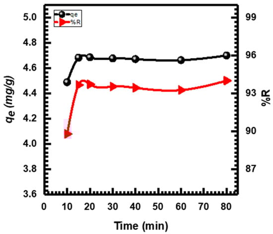The study examined the adsorption of MB dye at varying contact times (10–80 min) and discovered that the uptake of dye increased as contact time increased. Equilibrium was reached after 15 min (as shown in Figure 9). Based on these discoveries, the adsorption process initiates swiftly on the outer surface of the adsorbent, succeeded by a more gradual internal diffusion process, which ultimately governs the adsorption rate. Initially, adsorption occurs quickly due to the availability of numerous surface sites. However, as time progresses, accessibility of the remaining surface sites diminishes, causing the solute molecules in the solid and bulk phases to repel each other. Consequently, it takes a longer period to achieve equilibrium [].