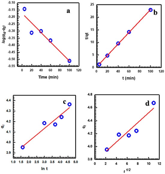 In this study, adsorption kinetic experiments were conducted under different time intervals ranging from 10 to 80 min. The pH was maintained at 8, while the amount of NGC used was 0.006 g, and the temperature remained constant throughout the experiments. The main objective of this investigation was to gain insights into the adsorption kinetics of MB on NGC by exploring four fundamental kinetic mechanisms. These mechanisms included the pseudo-first-order Equation (4), the pseudo-second-order Equation (5), the Elovich Equation (6), and the intraparticle diffusion Equation (7). By examining these mechanisms, a comprehensive understanding of the adsorption kinetics of MB on NGC could be achieved [,,].