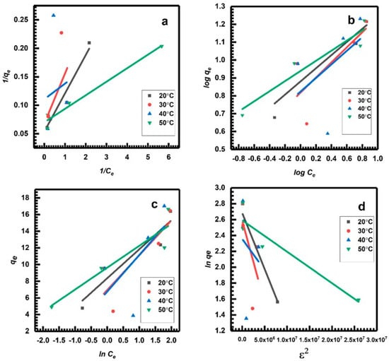 The study examined the impact of different concentrations (10, 20, 30, and 40 mg L−1) and temperatures (20, 30, 40, and 50 °C) on batch MB adsorption experiments on NGC at pH 8. To effectively analyze the adsorption isotherms, four distinct models were employed: Langmuir Equation (8), Freundlich Equation (9), Temkin Equation (10), and Dubinin–Radushkevich Equation (11). Understanding patterns in adsorption isotherms is essential for optimizing adsorption systems and improving mechanisms of the adsorption process [,].