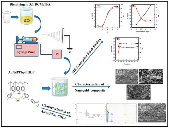 Methylene blue (MB) is a heterocyclic aromatic chemical that exists as a dark green powder. It is widely used in biology, chemistry, and the textile dyeing industry. It has been present in human and veterinary pharmacopeia for a long time. In the end, MB is discharged into the nearby environment causing real health problems. Exposure to MB can cause injuries to humans and animals []. It can also cause nausea, vomiting, and mental confusion. Direct contact can lead to eye burns, while inhalation leads to rapid or difficult breathing []. In this research, our objective is to incorporate Auo@PPh2-PIILP into nanofibers of polyethylene terephthalate (PET) in order to create a nanogold composite (NGC) capable of efficiently eliminating methylene blue (MB) from wastewater. The whole process is illustrated in Scheme 1.