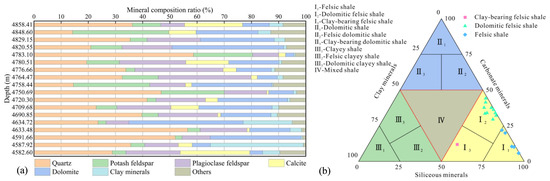 Subsequently, we use a ternary division method based on differences in mineral content, specifically whether the content of siliceous minerals, carbonate minerals, and clay minerals exceeds 50%, to classify the shale lithofacies [34]. The shale lithofacies are categorized into four major types: felsic shale, dolomitic shale, clayey shale, and mixed shale. Based on the mineral content, the three major lithofacies excluding mixed shale are further subdivided. Felsic shale is subdivided into felsic shale, dolomitic felsic shale, and clay-bearing felsic shale based on the content of the other two minerals. Dolomitic shale is subdivided into dolomitic shale, felsic dolomitic shale, and clay-bearing dolomitic shale. Clayey shale is subdivided into clayey shale, felsic clayey shale, and dolomitic clayey shale (Figure 2b). In total, the shale is classified into four major categories and ten subcategories of lithofacies. Based on this criterion, the shale lithofacies in the Fengcheng Formation of the Mahu Depression primarily consist of felsic shale, dolomitic felsic shale, and clay-bearing felsic shale. Combined with the interbedded siltstone interlayers, the lithofacies in the study area are ultimately classified into these four types.