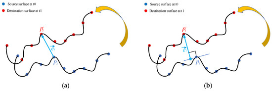 As shown in Figure 1b, pi’ is a point on the destination surface and pi is the corresponding point on the source surface. The vector ei is the normal vector to the tangent plane of the source surface at pi, which takes the distance from pi’ to the plane tangent to pi as the point-to-plane error metric. The objective function is to find a suitable rigid transformation that satisfies the minimum sum of all these distances.