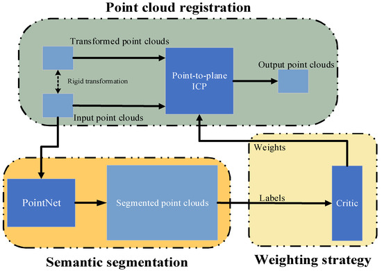 In conclusion, we can summarize the weighted PP-ICP process in this paper as follows: Firstly, PointNet semantically segments the input point cloud data, generating labels for different types of items along with corresponding parameters: importance, IoU, and CPA. Next, we assign weights to these category labels using an objective weighting method, which employs an improved CRITIC as the weighting strategy to calculate the corresponding weight values. Finally, we use the calculated weight values as the weight parameters for the point-to-plane ICP, registering the input point cloud effectively. Figure 2 illustrates the algorithm’s process of weighted PP-ICP.