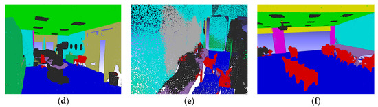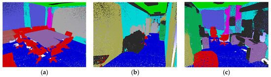 We use the entire S3DIS dataset in the experiments, from Area_1 to Area_6 [32]. When the S3DIS datasets are used as a whole, all the test data are the averaged results of the six indoor spaces in the datasets, as shown in Figure 3. PointNet is used for semantic segmentation of the point cloud.
