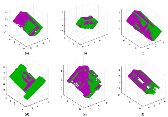 Registration results of S3DIS datasets: (a) Area_1; (b) Area_2; (c) Area_3; (d) Area_4; (e) Area_5; (f) Area_6. Rotational angle = [30°, 30°, 30°].