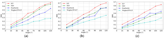 We conduct comparison experiments after determining the importance of labels in semantic segmentation. We set the translation to [0.1, 0.2, 0.15] for all tests. We set the change in angle in the rotational axis for each small rigid transformation in the weighted PP-ICP to 1°. Figure 7 and Table 14 display the root mean square error (RMS).