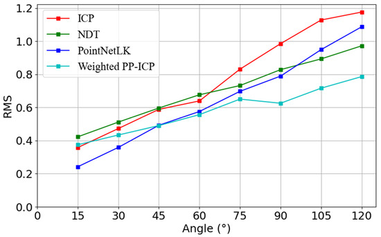 Figure 7 and Table 14 demonstrate that the proposed algorithm in this paper consistently achieves the smallest RMS in all tests, while the original ICP consistently demonstrates the highest RMS. This demonstrates the significant improvement in registration accuracy achieved by the algorithm proposed in this paper. On the other hand, as the rotation angle increases, the RMS of all the algorithms increases, but the weighted PP-ICP always has the smallest increase. This means that the algorithm is very stable when rigid bodies change shape at different rotation angles.