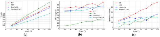 Figure 9 and Table 16 conclude that the weighted PP-ICP algorithm in this paper exhibits significantly shorter runtimes than the original ICP, NDT, and PointNetLK. However, in comparison to the NDT, the proposed algorithm does not perform better in terms of CPU or memory usage. The main reason for this is that the NDT breaks up the original point cloud into a voxel grid to obtain Gaussian distributions through feature extraction. It then changes these distributions to the reference point cloud’s coordinate system [4]. Compared to ICP, which directly matches the original point cloud, the NDT significantly reduces computational complexity, thereby enhancing the hardware efficiency of the algorithm.