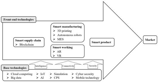 In addition to the 11 technologies listed in Table 1, virtual reality (VR), blockchain, and manufacturing execution system (MES) are also recognized as important Industry 4.0 technologies [4,9,33,51,52]. Hence, the Industry 4.0 technologies included in this study are cloud computing, IoT, big data and analytics, additive manufacturing (3D printing), autonomous robots, augmented reality (AR), simulation, cyber-physical system (CPS), cybersecurity, artificial intelligence (AI), mobile technology, VR, blockchain, and MES. According to Frank et al. [53], Industry 4.0 technologies can be categorized into base and front-end technologies. Front-end technologies further consist of smart supply chain technologies, smart manufacturing technologies, smart working technologies, and smart product technologies. As depicted in Figure 1, base technologies (e.g., AI, big data, and cybersecurity) furnish front-end technologies (e.g., autonomous robots) with connectivity, intelligence, and security.