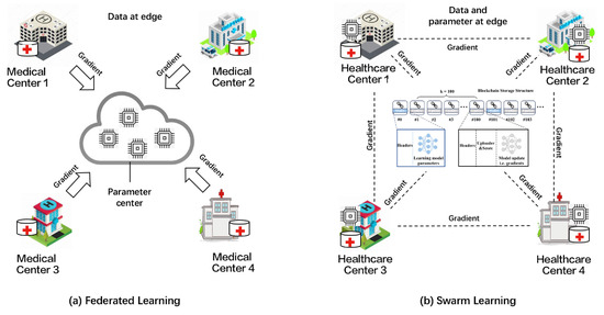 As shown in Figure 1a, Google’s federated Learning (FL) [11,12] is implemented with the help of a centralized server that aggregates all local model gradients and takes an overall average to produce a global model update. Although the problems of local data storage and local data confidentiality have been solved, the global model parameters are still processed and stored by the centralized server. Furthermore, such centralized architectures decrease fault tolerance. To solve these problems, Stefanie et al. [13] proposed swarm learning (SL), in which multiple medical centers share their local gradients through blockchain peer-to-peer networks, and the medical center that wins the consensus mechanism replaces the centralized parameter server to update the global parameters according to collected gradients.