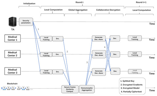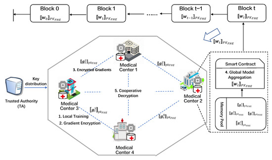 - represents a blockchain platform made up of self-organizing networks of interconnected medical centers (). Every node (i.e., ) on blockchain has the opportunity to aggregate the global model, so can replace a central aggregator. Smart contract (SC) deployed on the blockchain homomorphically aggregates the encrypted gradients to obtain the global collaboration model.