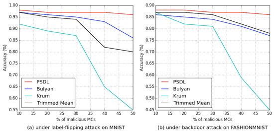 In our experiment, the total number K of is set to 10, and all are selected in each iteration during training. And we selected the models derived from convolutional neural networks (CNNs) with structure: , to train three different datasets using Python, Numpy, and Tensorflow. Then, the training data are evenly distributed to each , i.e., for both MNIST and FashionMNIST datasets, the size of each local dataset is 6000. We considered the proportion of different malicious from to . Our PBSL scheme is compared with SL and Krum. And the batch size b is set as 128.