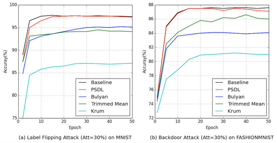 To verify that our PSDL scheme improves model accuracy, we use test accuracy and test error rate as evaluation measures on different training datasets. In the case of different numbers of malicious , the results of our PBSL scheme were verified by using the no-attack FedSGD scheme [38] as the baseline, and the Krum scheme [16], Bulyan [16], Trim-mean [39] as the control.