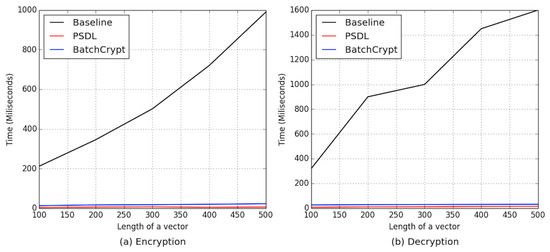 Comparison of the cost time of encryption and decryption in baseline, BatchCrypt, and PBSL.