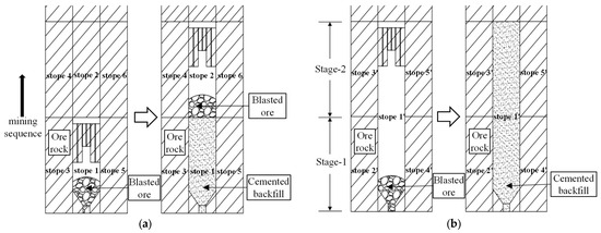 In this mining method, a traditional bottom-up mining sequence is usually adopted, in which the ore body is vertically divided into a number of mining stages, as illustrated in Figure 1a, where the stopes (1, 3, 5) in Stage-1 are excavated and then backfilled to provide a base platform for the mining of upper stopes (2, 4, 6) in Stage-2. Meanwhile, continuous stopes are divided along the horizontal direction of each stage, and the primary stopes (1, 2) are excavated preferentially and backfilled with cement to serve as artificial vertical pillars for the following excavations of secondary stopes (3, 4, 5, 6), which are mostly backfilled without adding cement to save costs. Undoubtedly, due to the higher efficiency of long-hole blasting, larger stope sizes can increase the stope production capacity and reduce the mining costs per excavated ore. But due to a larger exposed surface of the surrounding rockmass and backfill, it usually leads to a higher safety risk of stope failure. Therefore, the determination of reasonable dimension parameters (height, length and width) of the stopes is significant to the design of the mining process considering the stoping stability, capacity and costs.