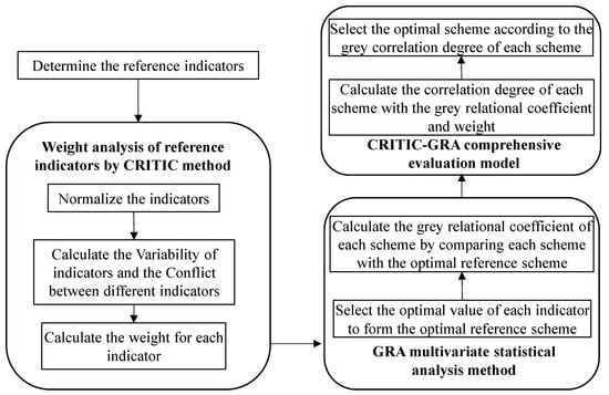 The CRITIC-GRA model proposed for selecting the optimal scheme considering the effects of multi-indicators consists of four key modules: the determination of all the considered possible influential indicators; analysis on the weight values of all the considered indicators using the CRITIC method; statistical analysis on the ranging conditions of each indicator using the GRA method to obtain the grey correlation coefficient in each scheme; and calculations on the grey correlation coefficient of each preset scheme with the weight values of all the considered indicators to obtain the grey correlation degree for each scheme. The obtained grey correlation degree serves as the only quantitative criterion to evaluate the optimum out of all the preset schemes.