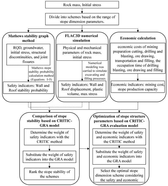 A flow chart of the CRITIC-GRA model to quantitatively select the optimal dimension scheme with effects of multi-indicators is shown in Figure 2. In order to apply the newly proposed CRITIC-GRA model to optimize stope dimensions after considering multi-indicators such as open stope stability, production capacity and mining costs, the detailed procedure and all the influences considered are highlighted in Figure 3.