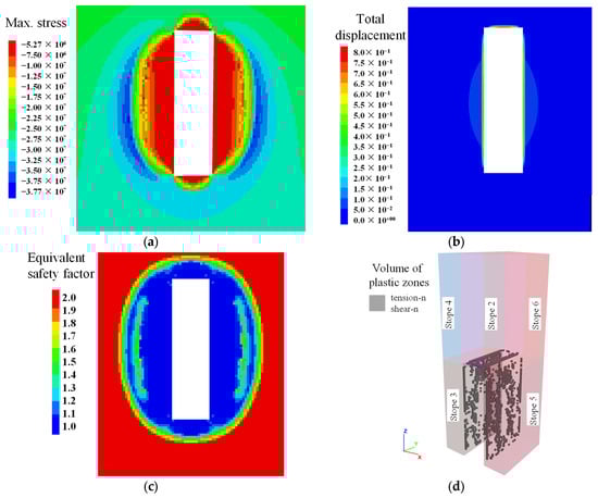 Numerical simulated results of typical stope dimension with width 15 m, length 40 m, height 60 m: (a) Maximum stress, Pa; (b) total displacement, m; (c) equivalent factor of safety; and (d) volume of plastic zones.