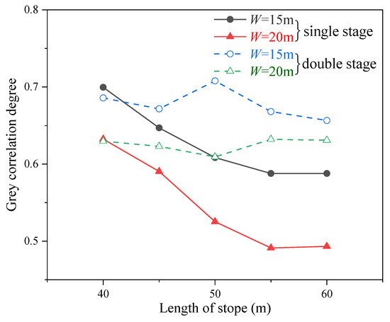In addition, Figure 7 shows that with the increase in stope length, the grey correlation degrees for single stage open stope schemes decreased greatly while that of the double stage open stope schemes had no obvious reduction, which meant the effect of length variation was more sensitive to the single stage open stopes. For the double stage open stopes, the stope width has a significant influence on the stope dimension optimization, but the linear trend of the stope width has not been witnessed, after considering the stability and economic indexes at the same time.