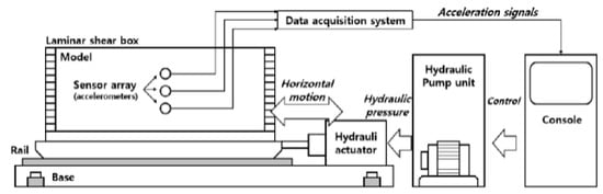 In the study of multi-layered soil behavior, a 1 g shaking table offers a controlled setting for simulating seismic events and examining the dynamic response of layered soils. This study employed various experimental components to explore soil dynamics. Figure 1 depicts a schematic diagram of the 1 g shaking-table test system, serving as the central component for conducting experiments and grasping the dynamic properties of the multi-layered soils. The key equipment included the 1 g shaking-table test equipment system, a laminar shear box, a data logger, and an accelerometer. These specialized tools facilitated the replication of ground motions, while the use of the 1 g shaking table enabled analysis with the aim of comprehending the behavior and stability of multi-layered soil under diverse dynamic conditions. The experimental system utilized in this study aligns with that used by Kim et al., 2020 [].