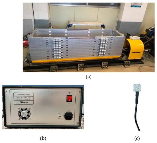 The laminar shear box comprised 12 independently movable aluminum frames, simulating infinitely expanding ground boundary conditions for horizontal shear motion, as depicted in Figure 2a. The dimensions of the aluminum frames were 2000 mm (W) × 600 mm (L) × 600 mm (H), with each frame having a thickness of 4.5 cm and an approximate frame spacing of 0.5 cm. Data logging involved measuring and recording physical or electrical parameters over time. In this study, seismic acceleration was captured using ARF-20A acceleration transducers, capable of measuring up to 20 m/s2. The data logger we employed was the 24-channel SDL-350R model, compatible with ARF-20A, offering a data storage interval of up to 0.005 s. Visuals of the data logger and accelerometer used are shown in Figure 2b,c.