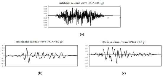 The acceleration–time history of the input ground motions: (a) artificial seismic wave; (b) Hachinohe seismic wave; (c) Ofunato seismic wave.
