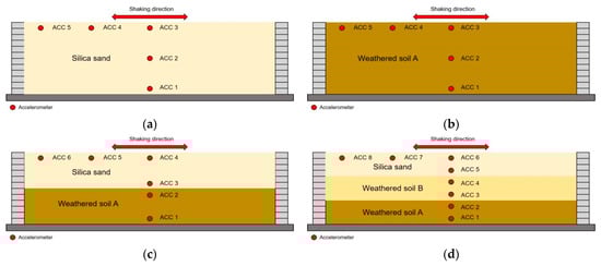 Figure 4 depicts the experimental design for each soil layer, including the placement of the accelerometers. Through these four experiments, the different behaviors of the soil layers were measured. The type of soil and the height of the soil can be referred to Figure 3.
