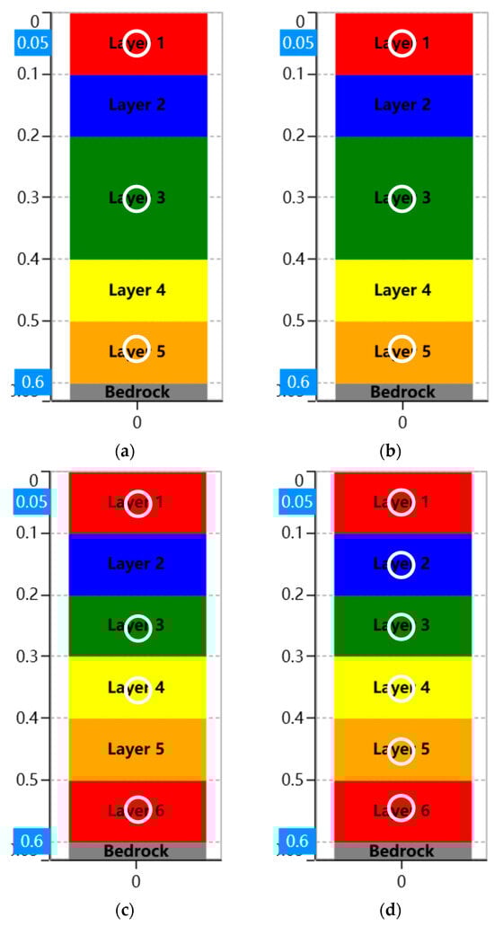 In this study, four models were established in DEEPSOIL, and their cross-sectional diagrams are shown in Figure 5. The position of the derived results in DEEPSOIL (white circle) was completely consistent with that of the experimental design (Figure 4).