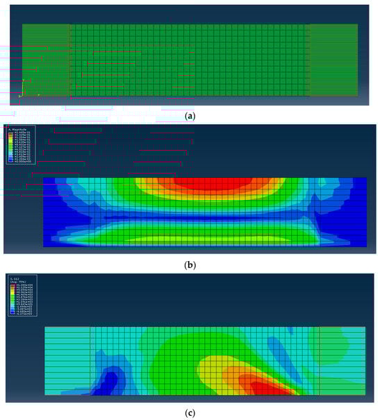 The model was divided into a mesh with a size of 0.05 × 0.05 m, which was the best mesh size obtained after multiple mesh-size tests. The infinite boundary section utilized CINPE4 elements, establishing a 2D framework bounded solely horizontally and vertically. Dynamic analysis was conducted with a fixed time increment of 0.001 s. Notably, the bottom boundary solely experienced horizontal acceleration and lacked vertical motion capacity. To mitigate boundary effects on the model analysis outcomes, both boundary sides were reconfigured as infinite boundaries, aligning their conditions as closely as feasible with those of the laminar shear box, as shown in Figure 6a. Figure 6b,c show the acceleration–time results and shear stress results.
