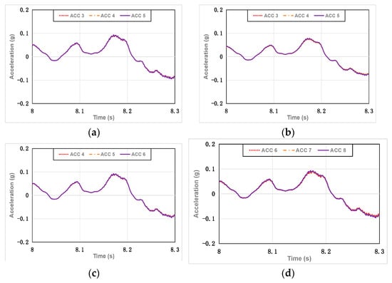 Partial acceleration–time history graphs of the experimental results. (a) Case 1; (b) Case 2; (c) Case 3; (d) Case 4.