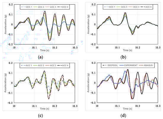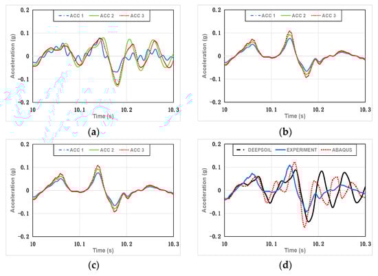 Partial acceleration–time history graphs for Case 3. (a) DEEPSOIL results; (b) experimental results; (c) ABAQUS results; (d) DEEPSOIL, experimental, and ABAQUS results (ACC 4).