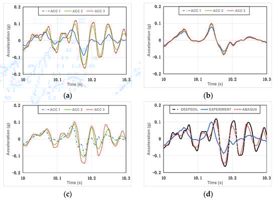Partial acceleration–time history graphs for Case 2. (a) DEEPSOIL results; (b) experimental results; (c) ABAQUS results; (d) DEEPSOIL, experimental, and ABAQUS results (ACC 3).