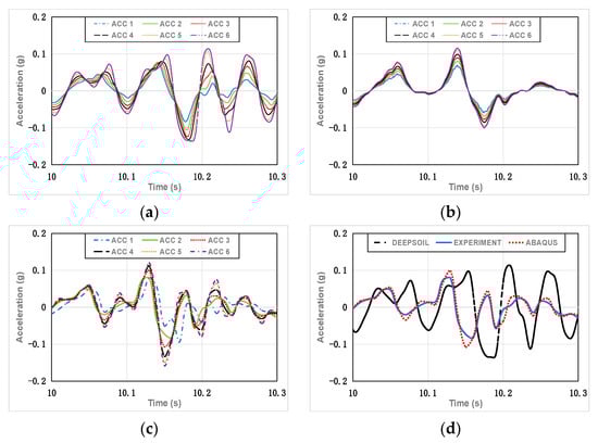 Partial acceleration–time history graphs for Case 4. (a) DEEPSOIL results; (b) experimental results; (c) ABAQUS results; (d) DEEPSOIL, experimental, and ABAQUS results (ACC 6).