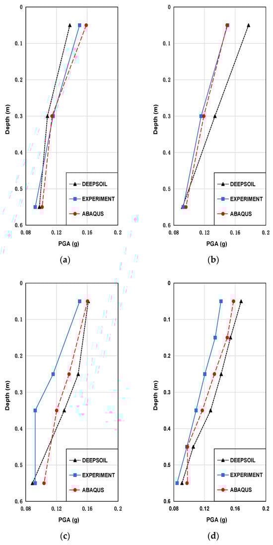 In Figure 12a, the PGA of the DEEPSOIL results is generally lower than that of the experimental and ABAQUS results. However, in Figure 12b–d, the PGA of the DEEPSOIL results tends to be higher compared to those of the experimental and ABAQUS results. This is attributed to the effective amplification of DEEPSOIL on weathered soil. Additionally, the densely bound particles in weathered soil contribute to a higher velocity of acoustic wave propagation, facilitating rapid acceleration amplification. The PGA of the experimental and ABAQUS results shows closer agreement.
