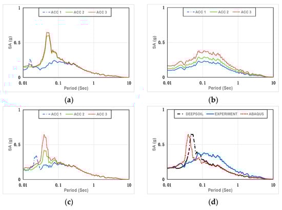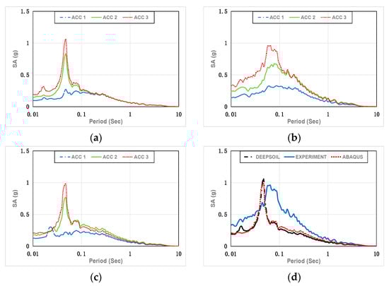 Spectral Acceleration of the artificial seismic wave in Case 1. (a) DEEPSOIL results; (b) experimental results; (c) ABAQUS results; (d) DEEPSOIL, experimental, and ABAQUS results (ACC 3).
